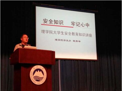 2017年9月30日中午12点半,理学院在汉卿会堂为2017级本科生开展了大学生安全知识讲座。理学院团委书记兼2017级辅导员鲍青峰老师从政治安全、交通安全、宿舍安全、网络安全和求职安全等方面为向新生进行了讲解,理学院2017级全体本科生参加了这次讲座。