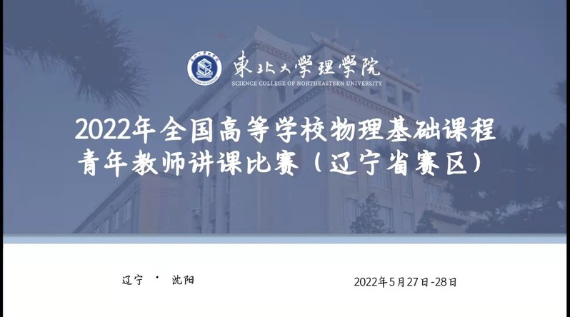 2022年5月27日-28日,由中国物理学会物理教学委员会、教育部高等学校大学物理课程教学指导委员会主办的“2022年全国高等学校物理基础课程青年教师讲课比赛”辽宁赛区选拔赛由东北大学理学院在线承办,顺利举行。