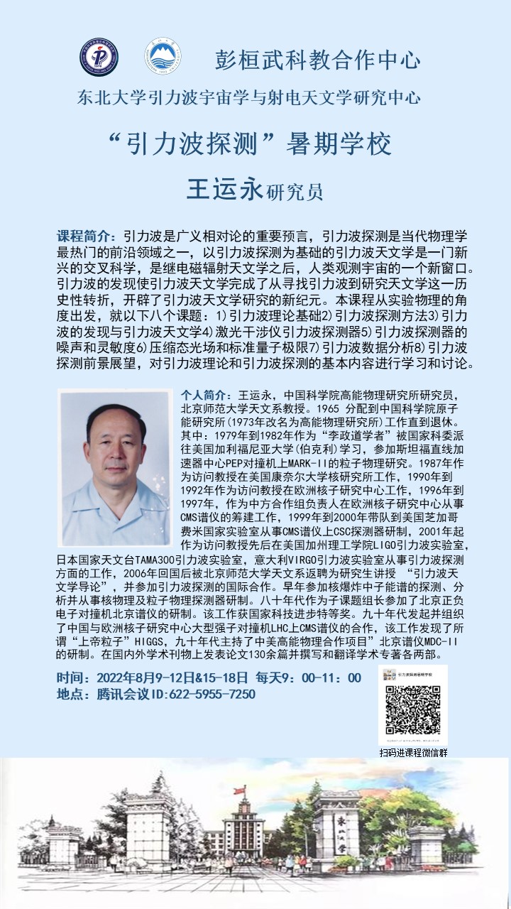 2022年8月9-18日,东北大学理学院成功举办“引力波探测”暑期学校。本次暑期学校由中科院理论物理研究所-东北大学彭桓武科教合作中心和东北大学引力波宇宙学与射电天文学研究中心联合主办。暑期学校荣幸邀请到了中国科学院高能物理研究所王运永研究员进行授课。由于疫情原因,课程采取线上研讨的方式进行,来自东北大学、中国科学院国家天文台、中国科学院理论物理研究所、中国科学院高能物理研究所、北京师范大学、华中师范大学、重庆邮电大学、河北师范大学、沈阳航空航天大学、沈阳师范大学、西华师范大学等国内多所高校及科研院所近200位学员(包括科研人员以及研究生和本科生)参加了此次暑期学校。