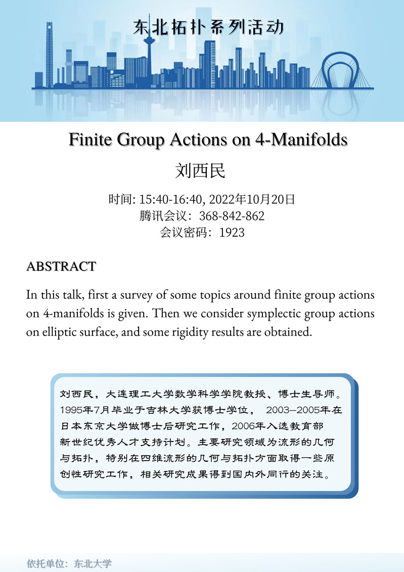 首次活动计划于2022年10月20日开始举办,主讲人为大连理工大学刘西民教授,报告题目为:Finite Group Actions on 4-Manifolds. 系列活动计划于每周四下午3时40分开展(根据报告人的时间作相应调整),每次活动将邀请1-2位国内外专家作一小时的报告,欢迎国内外学者参会,同学参加!