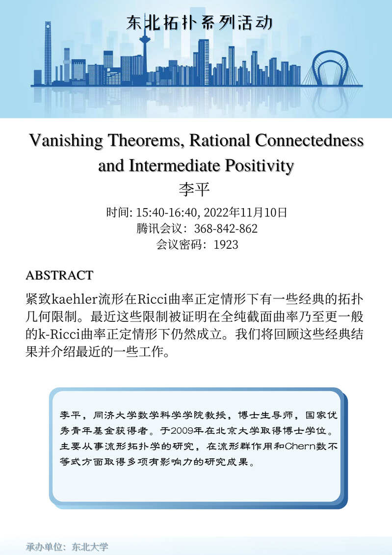 2022年11月10日的主讲人为同济大学数学科学学院李平教授,报告题目为: Vanishing Theorems, Rational Connectedness and Intermediate Positivity.