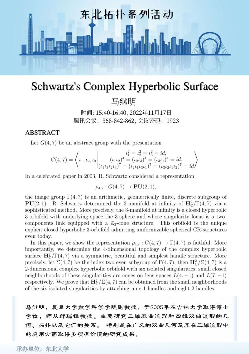 20221114日的主讲人为复旦大学数学科学学院马继明教授,报告题目为: Schwartz’s complex hyperbolic surface.