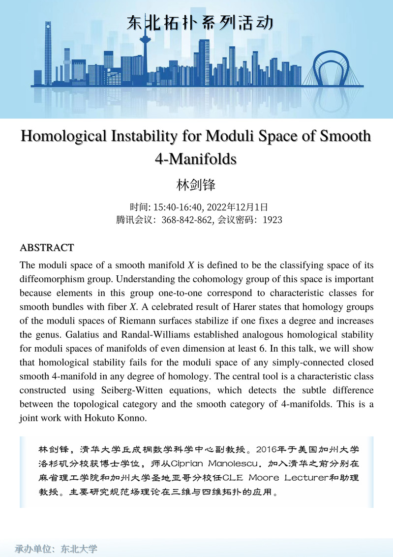 2022年12月1日的主讲人为清华大学丘成桐数学科学学院林剑锋副教授,报告题目为: Homological instability for moduli space of smooth 4-manifolds.
