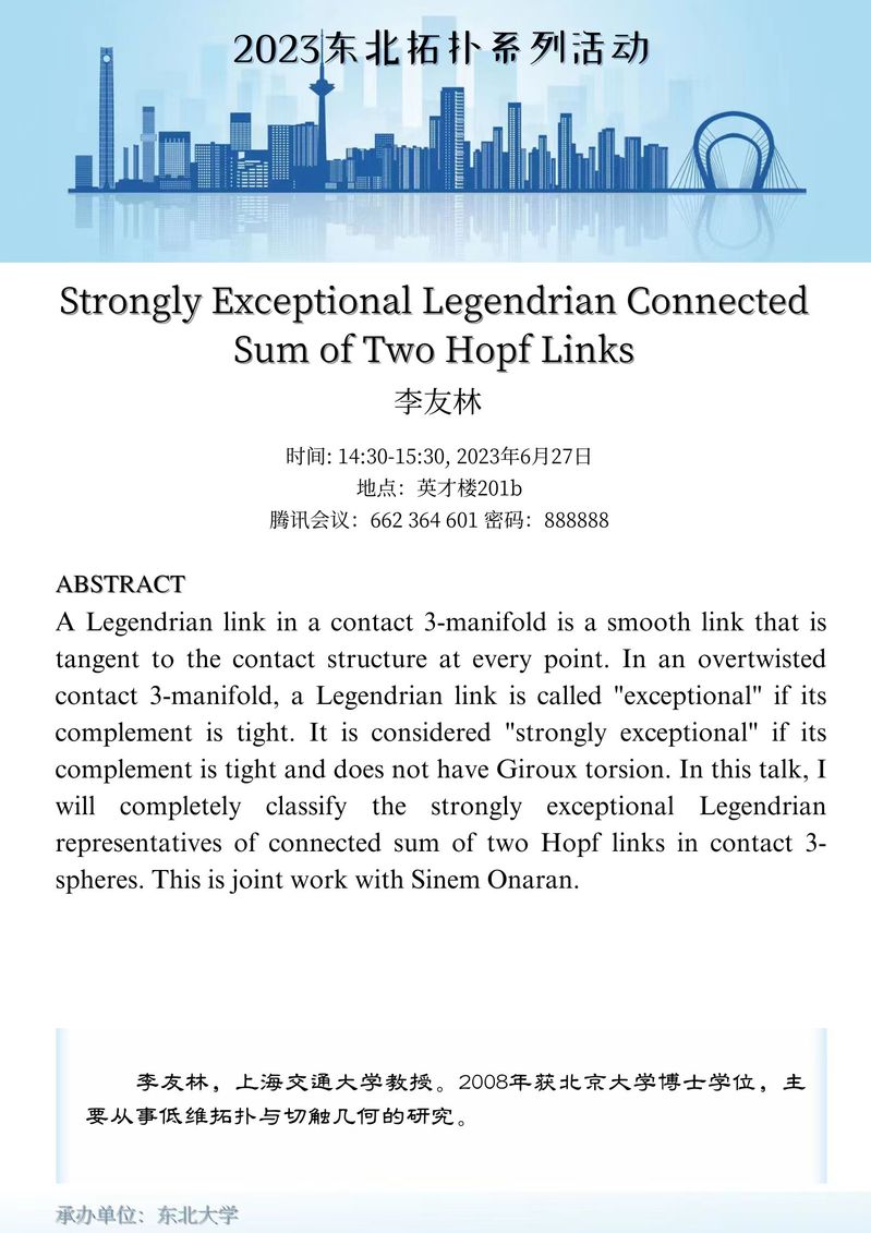 东北拓扑系列活动由东北大学数学系谷世杰教授牵头,联合东北师范大学陈亮教授,大连理工大学李风玲教授,东北师范大学张发泽教授,延边大学钟立楠教授和大连海事大学鄂强副教授组织筹备开展。期望促进东北地区拓扑学者与国内外同行的交流。活动将以线上线下混合的方式进行,并将线上参会链接分享给组织承办学校的学生和感兴趣的同行。