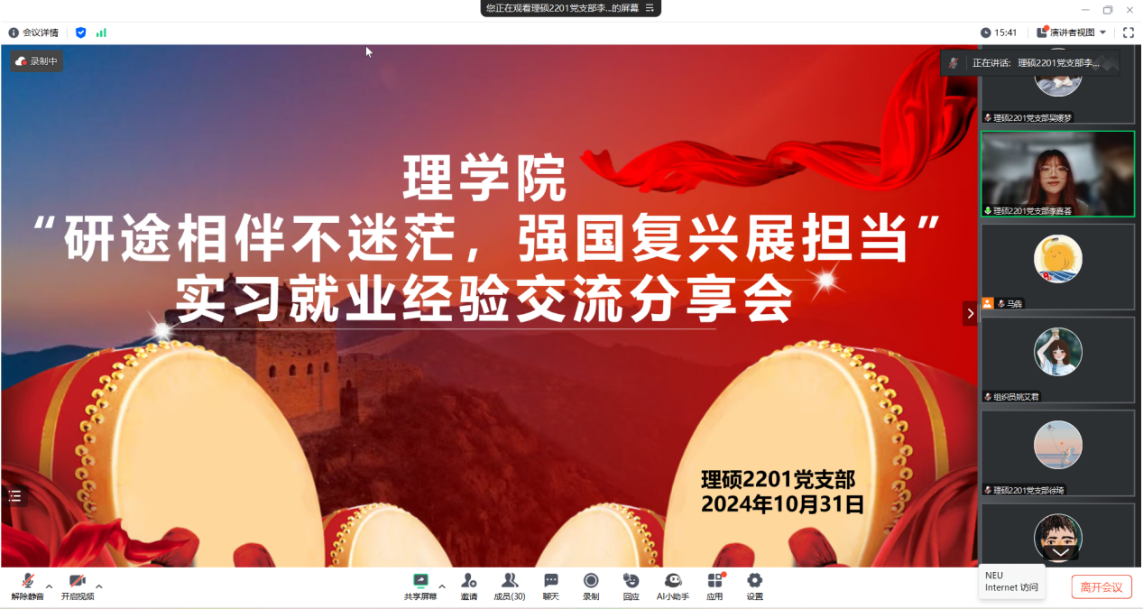 为深入推进党建工作与业务工作深度融合,助力学生明确职业规划,提升就业竞争力,激发学生投身国家建设的责任感与使命感,10月31日晚,理学院学生党总支依托理学院2022级硕士生第一党支部以线上交流方式举办“研途相伴不迷茫 强国复兴展担当”主题实习就业经验交流会。理学院党委副书记兼副院长马犇、党委组织员及理学院学生党支部学生党员代表参加会议。