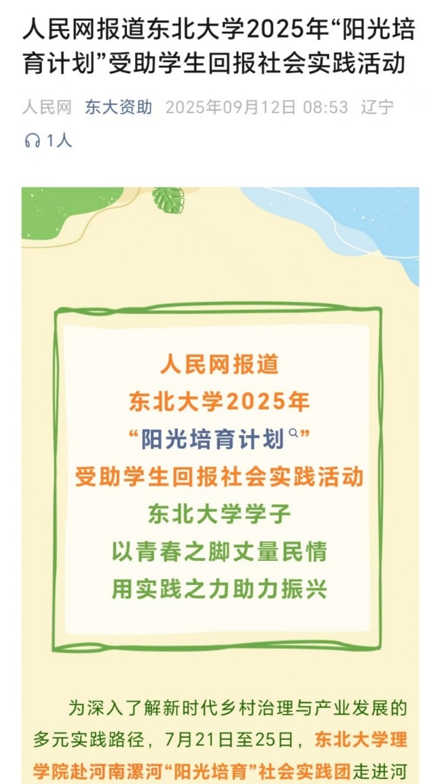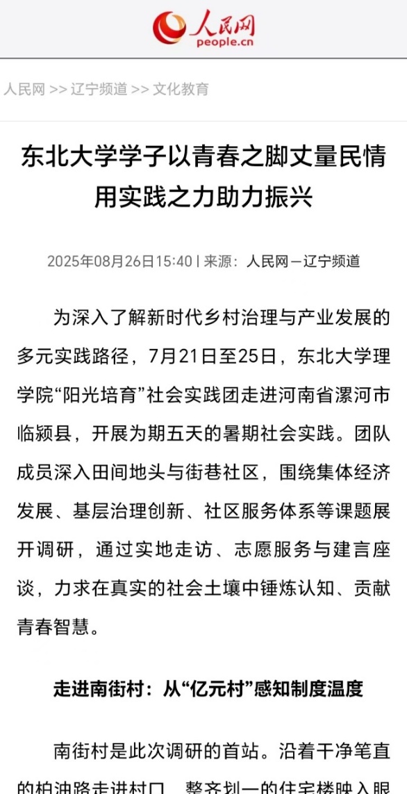 青春逢盛世,实践正当时。2025年暑期,东北大学理学院学子以脚步丈量祖国大地,以专业所学回应社会需求,在红色传承中坚定理想,在乡村振兴中贡献智慧,在文化守护中增强自信,在公益服务中传递温暖,在工业探索中激发担当。未来,理学院将持续深化实践育人体系,引导更多青年学子把个人理想融入党和人民的事业,以青春之我、奋斗之我投身强国伟业新征程。