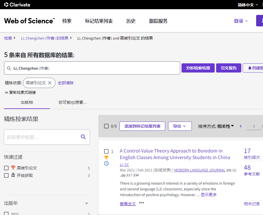 日前,根据美国Clarivate Analytics(科睿唯安)公司旗下Web of Science数据库最新公布的数据显示,我院青年教师李成陈博士以第一作者(或独立作者)发表的5篇高水平论文均进入ESI(1%)高被引论文之列。这5篇ESI高被引论文均发表于语言学一区SSCI来源期刊,包括The Modern Language Journal, System, Journal of Multilingual and Multicultural Development, Applied Linguistics Review。