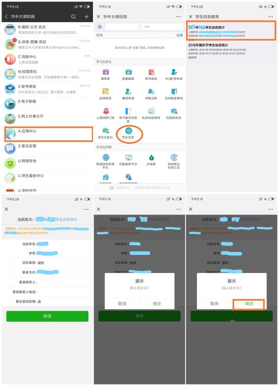 7、2月16日(周日)19点之前各班级班主任助理、辅导员将进行全面查寝,清查学生到校情况,与未返校的学生及时取得联系,并督促所有学生于2月16日(周日)晚23点前完成学生返校动态上报:在“华中大微校园”微信公众号中,点击“A应用中心”,在“学习&就业”栏目中点击“学生动态”,选择“2020年寒假学生动态统计”,填写返校情况;