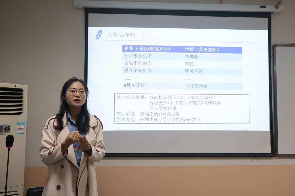 随后上场的是签约东风雷诺汽车有限公司的闫瑞哲学姐。她建议大家处理好学业与求职之间的关系,提前规划好各阶段的任务。通过总结自己在面试中遇到的问题,她提到面试中要避免踩到“雷区”,建议大家在应聘时要对工作内容有充分的了解,同时多跑宣讲会,多去现场体验面试场面,结合自身情况有针对性的做好应试准备。