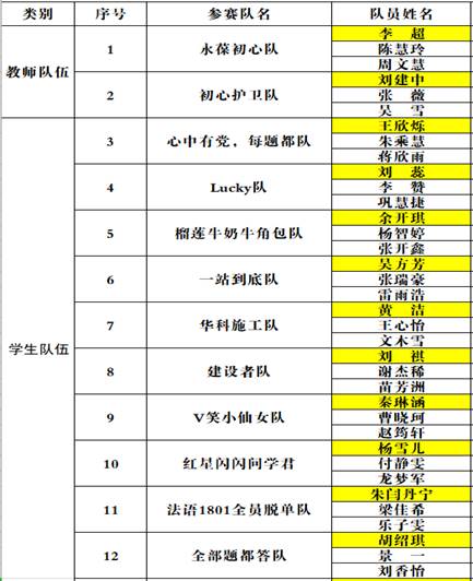 经过激烈的笔试初选,最终进入决赛的12支队伍(学生队伍10支,教工队伍2支)名单如下: