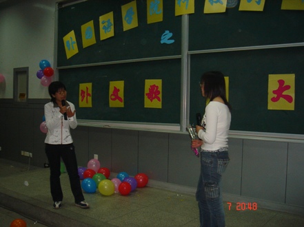 比赛进行到一半的时候,有一个游戏环节——歌曲接龙。在同学们的强烈要求下,辅导员沈挺和兰行行被请上了舞台。两位辅导员的精彩表演立即引来了同学们阵阵热烈的掌声和一片叫好声,并将比赛推向了高潮,现场气氛变得愈发活跃。
