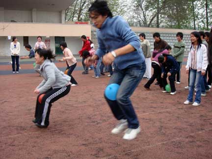 “气球要爆啦!”这恐怕是参赛队员最担心的了,这个项目要求较高,比赛者腿夹气球跳30米传给另一个队员进行接力,比赛过程中一旦气球爆了,该组就被淘汰了。被挤压变形的气球让整个比赛险象环生,最后,由学术部和心理部组成的“联合舰队”夺得第一。