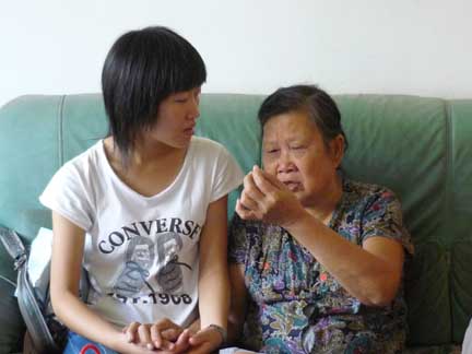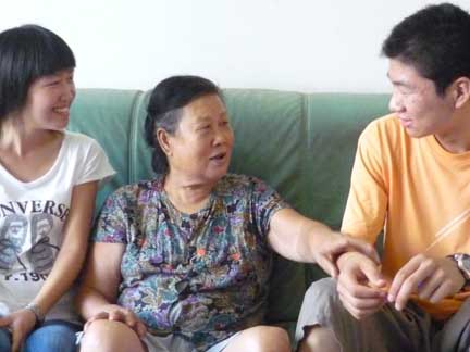 上午九点,同学们来到了关山小区江婆婆家里。简陋的房屋,冷清的门庭,中秋团圆的日子江婆婆一个人在家里。同学们的到来让婆婆很感动,她热情地招呼大家坐。婆婆的老伴已经10年前过世了,虽然有 4个孩子,但儿女们也有各自的负担:大儿子已经退休,还有一个儿子在读书;两个女儿家中状况也不太好;40多岁的小儿子,至今仍单身而且没有工作。平时,在外的孩子很少回家看她,也只有过年的时候才会聚在一起吃饭。大家问婆婆,今天是中秋节,全家会聚聚,吃团圆饭吗?婆婆说,孩子们都挺忙的,没时间回家,今天还是一个人过。江婆婆丝毫抱怨都没有,只是说:孩子他们也不容易啊!