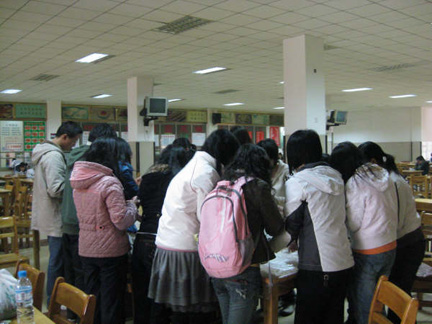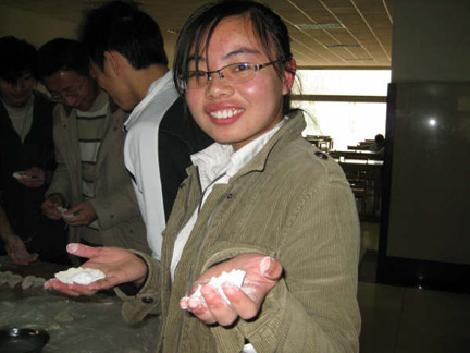 归功于班长樊建忠同学2个多小时的精心准备,同学们才得以见到大袋大袋的饺子馅,大包大包的饺子皮。以上这些材料给了同学们快乐的40多分钟。“饺子好吃,实在难做。”先不要说众口难调,单是在华科这样一所全国性高校里,来自五湖四海的同学们对饺子的概念就已经是五花八门。包法各具特色,样子也千奇百怪。有的捏成了烧卖,有的包成了馄饨,更有甚者将其弄成了“娃娃头”。想象力之丰富,实在让人叹服。虽然做出来的效果从审美角度看似乎有些“不堪入目”,但过程无疑是快乐的,现场气氛也是极其高涨的,还不时会有人推销自己的“招牌”饺子。