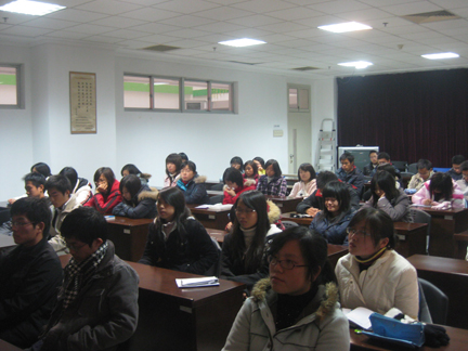 随后,五位学生代表作为嘉宾以PPT的形式同大家分享了自己的看法,07级日语班杨琳琳首先结合自己选修的英语专业二学位,从原因、影响、个人感受,意见等方面分析了二学位的必要性以及与未来就业的关系。07级英语班王子杭在谈及个人感受时说:二学位听上去光鲜,也是一份经历,但是就本班调查统计结果看,如果没有很大兴趣和毅力,建议大家最好不要去学,浪费时间和金钱。幽默的语言引得在场阵阵笑声。