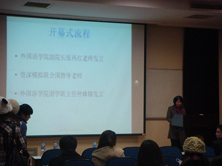 12月9日晚,来自全国各地的20多所高校齐聚华中大,共同揭幕了2011年度williamhill中文模拟联合国大会。近200名代表共组成了94支参赛队伍,从下午四点钟起开始陆续到场进行登记注册,晚上5点,活动开幕式正式在科技楼104举行,william威廉中文副院长张再红教授发表致辞,宣布了模联正式开幕。