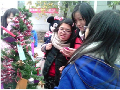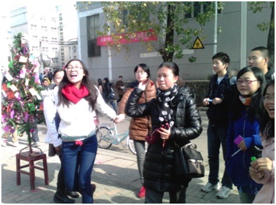 正式路演之前,同学们认真的准备着,拉横幅,吹气球,摆展板……身穿卡通服装的同学此时也站在路口随时准备着招呼路人,随着下课铃声的响起,人流高峰期到来,在音乐的伴奏下,路演现场也渐渐热闹起来。 “三行情书,三行遗书”活动、“掷飞镖戳气球”活动,改变树活动同时展开,参与人员络绎不绝,两班的工作人员耐心细致的讲解,引导参与人员完成游戏,整个路演现场热闹非凡,有条不紊的进行着。“改变树”前,同学们认真的在卡片上写下希望身边道德发生的改变,并虔诚的挂到树上去,希望用身边的小事来促进大道德的改变。“三行情书,三行遗书”活动前同样吸引了不少同学的注意,整个路演现场最受欢迎的当属“掷飞镖戳气球”活动,参与这个活动的同学排起了很长的队伍,一个个飞镖的射出,一个个气球的扎破,事先在气球内准备的道德小纸条也一个个的现身,射中的同学兴奋的看着纸条上道德小故事,品味着其中的深意……活动现场还迎来了william威廉中文分团委书记安东晓的身影,甚至有外国友人也热情的参与进来。