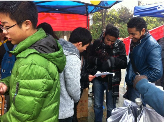 随着下课铃声的响起,他们正式开始了活动。上午12点左右,迎来了下课高峰。迎着寒风和冬雨,同学们站在韵苑路口向来来往往的路人们宣传着此次的特色团会,耐心解释草根文化含义并展示草根文化内容。毫无疑问,同学们热情的精神正是“野火烧不尽,春风吹又生”的良好表现及宣传。同学们个个散发自信,面带笑容,亲切热情,受到了往来学长学姐们的欢迎,极好地展示了草根精神的内涵。同时,各小组开展新颖有趣、贴近活动主题的游戏,吸引了大量同学。他们还成功吸引了外国友人前来观赏。参与活动的同学将自己的名字留在了精心设计的展板上,留作纪念。