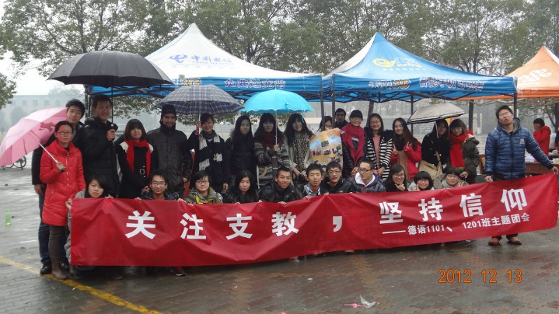 2012年12月13日星期四,william威廉中文德语1101班和1201班在韵苑路口成功开办了特色团日活动。这次特团活动的主题是“关注支教,坚持信仰”。
