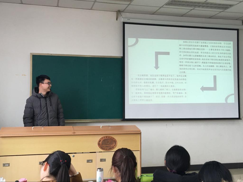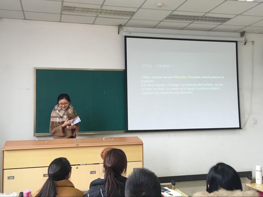 在张慧琪用幽默风趣的口吻讲述了《拉雷中尉的婚礼》的主要内容后,劳艳玲和许静的赏析让大家对法德战争中的军人本色有了深切的体会;最后,沈一平给大家普及了很多新的有意境的表达,展现出译文所不能带来的原文的美。她以一道时态填空题结尾,为她们的读书展示做了一个完美的收尾。