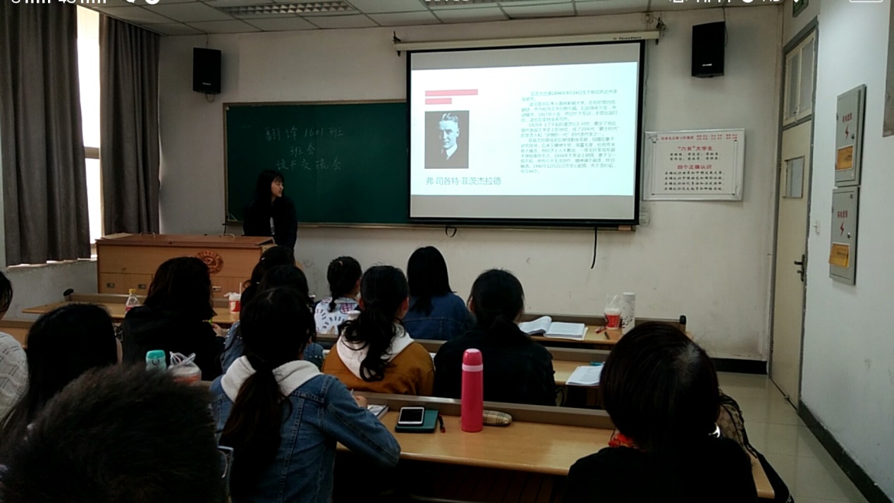 翻译班本次选择了菲茨杰拉德的经典小说——《了不起的盖茨比》作为班级阅读交流的书目。在班长的主持下,同学们首先对作者菲茨杰拉德做出了进一步了解,并回顾了本书的主要内容。