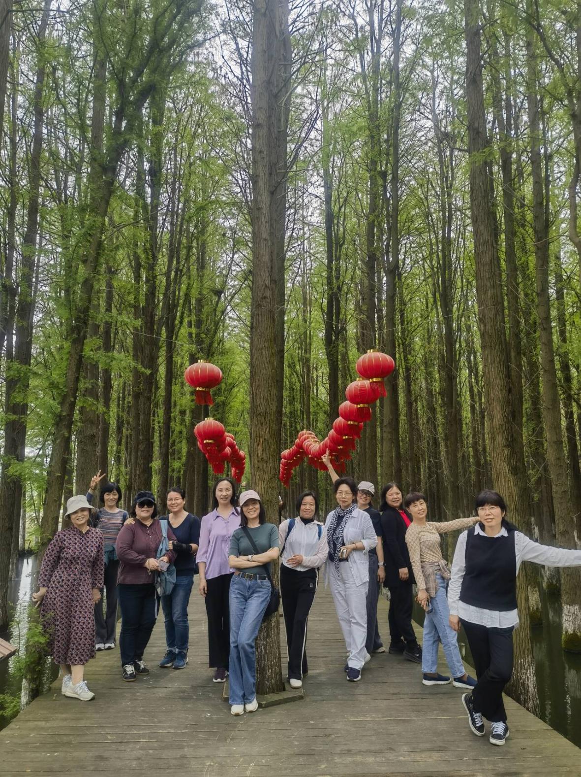 4月20日,大家乘车前往于仙桃市赵西垸林场,体验江汉平原闲适乡村田园生活的悠然意境。老师们坐上画舫船游览水上森林,画舫船穿行于遮天蔽日、幽深静谧的水上池杉丛林,大家尽情在这天然氧吧中大口呼吸。之后,老师们漫步乡野湿地公园,欣赏纵横交错的河道湖泊,沿途岛屿、村落、水林的美景让大家忘却一切烦恼,欣然接受大自然的馈赠。