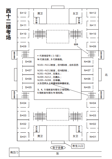 一、考试日当天,考生由南三门进入学校。进校门时,考生请出示身份证件原件以及准考证。