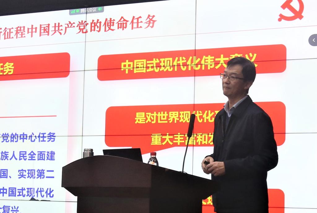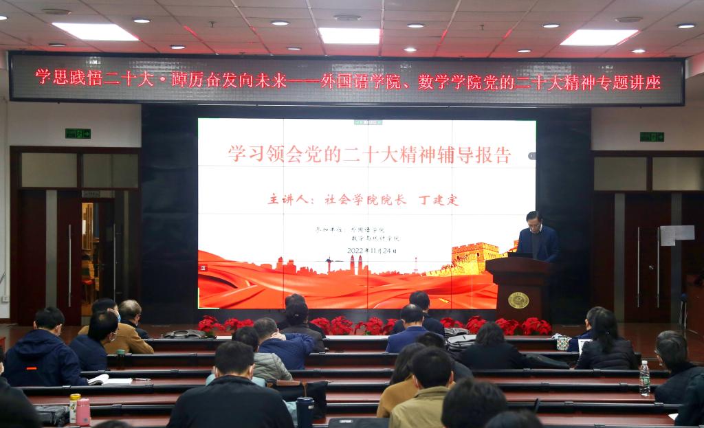 丁建定以“高举中国特色社会主义伟大旗帜,为全面建设社会主义现代化国家而团结奋斗”为主题,深入学习宣传贯彻党的二十大精神。他指出,党的二十大是在全党全国各族人民迈上全面建设社会主义现代化国家新征程、向第二个百年奋斗目标进军的关键时刻召开的一次十分重要的大会,是一次高举旗帜、凝聚力量、团结奋进的大会。他表示,中国正处在大发展大变革时期,不仅需要认识过去发展过程中的不足、总结奋斗路上取得的成就,更重要的是要指出未来新的发展方向。他指出,科教兴国和人才培养的国家战略与高校教师的教学工作紧密相关,要把学习党的二十大精神和习近平总书记关于高等教育工作的重要论述紧密结合起来,把党的二十大精神贯彻落实到教育改革发展各方面全过程。