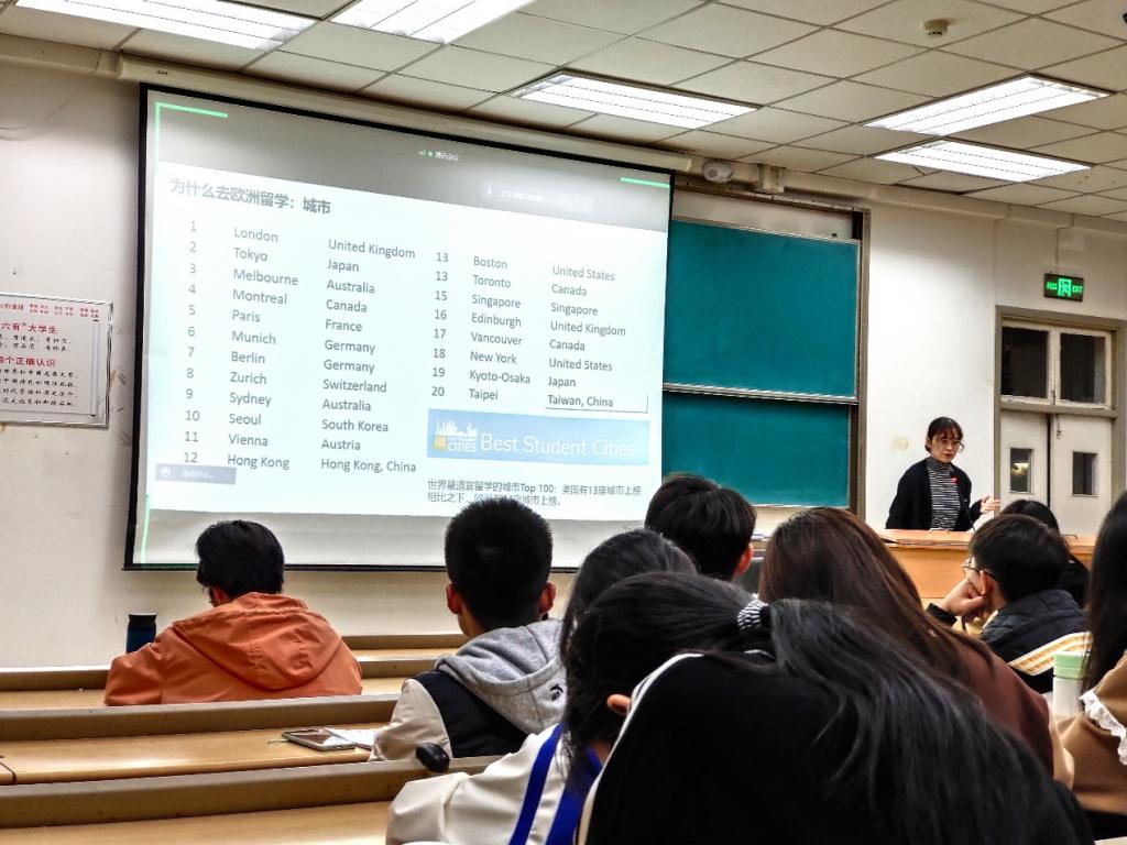 张园园老师以欧洲地图为切入点,带领同学们领略欧洲各地的名胜古迹、风土人情以及名人轶事,引起了学生浓厚的兴趣。她以权威的世界大学排名榜单和国外留学概况为依据,全面剖析华中大学子赴欧留学的优势;以国际时事政策为媒介,专业解读英国、法国、瑞士高校教育的利好政策,对比探究各著名高校的优势专业、特色专业和留学申请难易程度,为学生成功申请心仪的留学名校指点迷津。张老师特别强调了小语种学习在欧洲留学中的重要性与必要性,提醒有意留学欧洲的学生尽早规划,尽早准备。