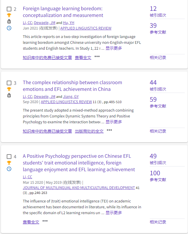 [4] Li, C. (2020). A Positive Psychology Perspective on Chinese EFL Students’ Trait Emotional Intelligence, Foreign Language Enjoyment and EFL Learning Achievement. Journal of Multilingual and Multicultural Development, 41(3), 246-263. (SSCI, Q1, 2020 IF: 22/193)