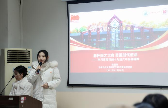 支部党员、校研究生红色理论学讲团成员赵亚琳围绕“胸怀国之大者,勇担时代使命”主题对十九届六中全会精神进行了详细深刻的解读。支部书记吴晨郡立足“讲好中国故事,助力大国外交”,带领大家对习近平总书记给北外教授的重要回信进行了学习和研讨。吴晨郡指出,我们要响应习总书记号召,争做“有家国情怀”、“有全球视野”、“有专业本领”的复合型外语人才。