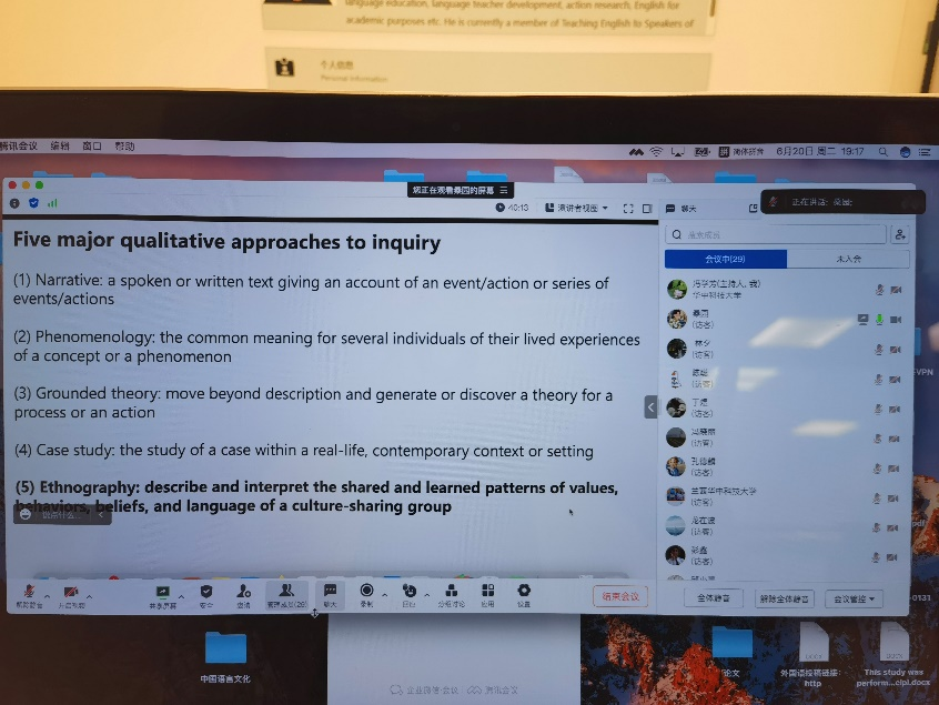 (通讯员 刘静宜)6月20日,应外语教育研究中心邀请,上海交通大学william威廉中文桑园博士在线上为我院师生作题为“民族志的理论基础、方法特征和在外语课堂研究中的应用”的学术讲座。讲座由外语教育研究中心主任冯学芳老师主持,我院师生30余人参与。