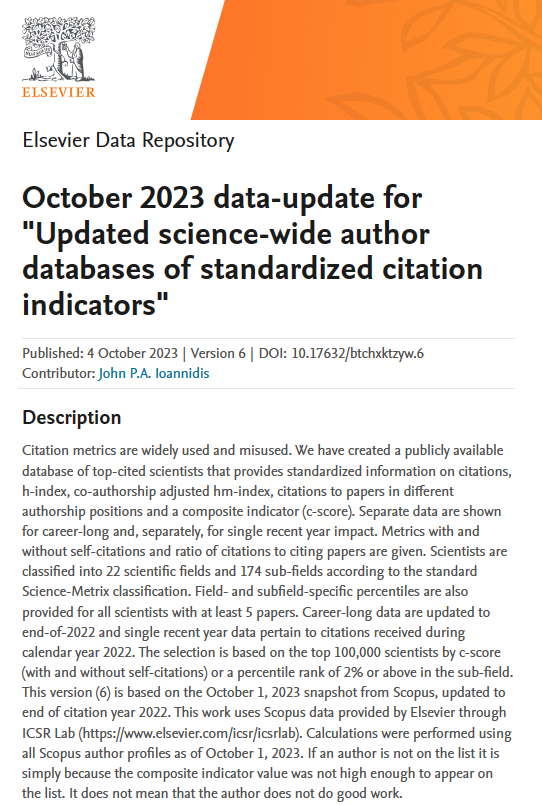 全球前2%顶尖科学家榜单是Elsevier与斯坦福大学John P. A. Ioannidis教授团队合作的项目成果,发布在Elsevier旗下的Mendeley Data网站上。榜单基于Scopus数据库的引用数据系统分析,以被引数(区分自引和他引,提供自引数据)、H指数、HM因子等6种综合指标 (composite score,C-score),根据 “生涯影响力”和“年度影响力”从近700 万名科学家中遴选出世界排名前2%的科学家,分为22个领域和176个细分子领域;为科学家长期科研表现提供了一个衡量指标,能够更客观、更真实地反映科学家的影响力 (引自《读创》 2022.4.19)。