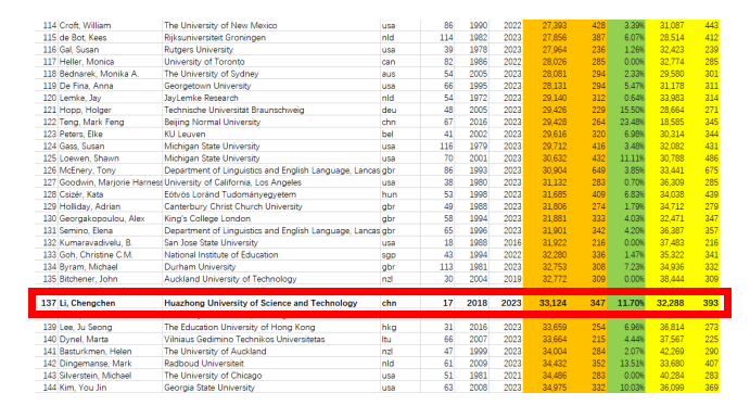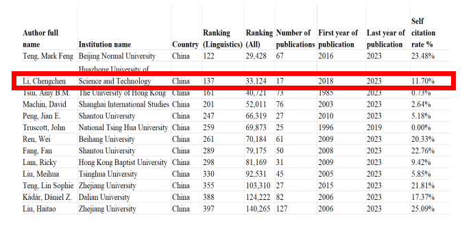 据统计,进入语言学学科世界前2%的学者共399名,李成陈副教授位列第137名,较去年前进199名。本年度中国大陆共8名学者入榜,较去年增加4名,李成陈副教授在其中位列第2。