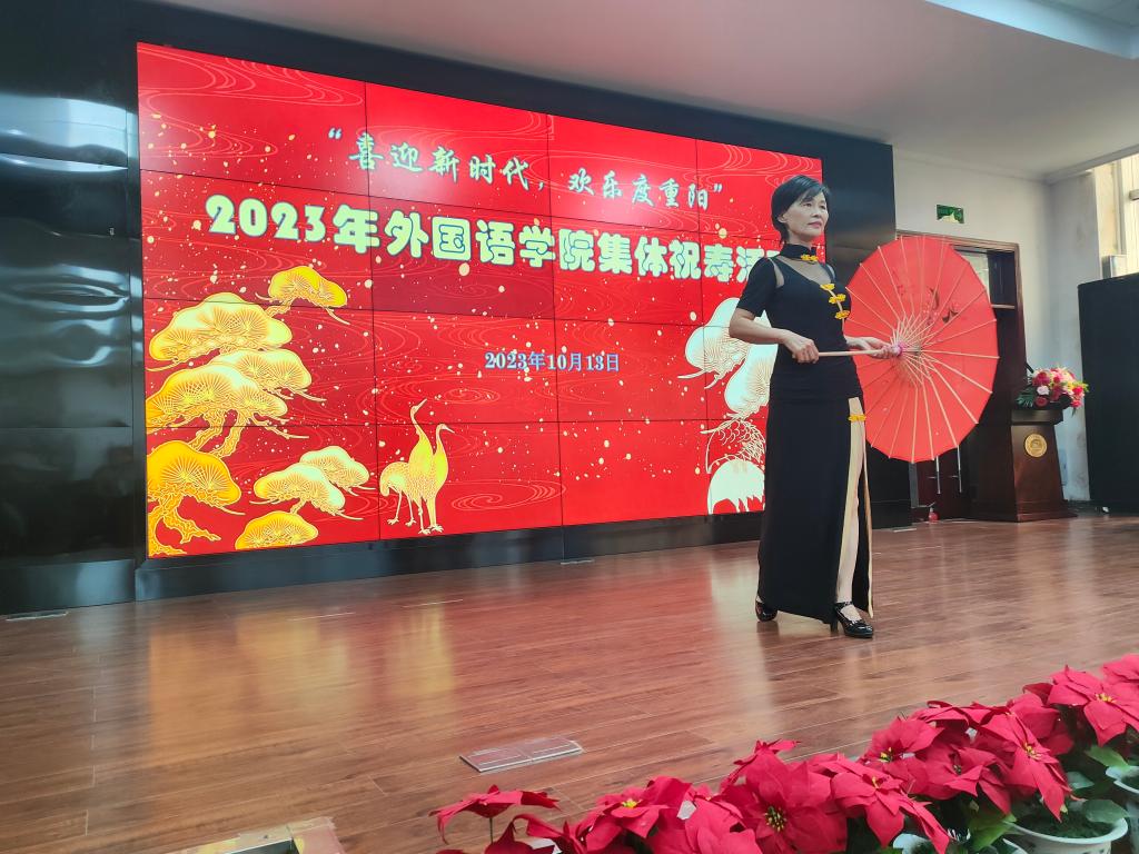 最后由学院退休老师带来了精彩的表演,将活动欢乐的气氛拉到最高点。70周岁的寿星徐建初老师表演楚剧《碧玉簪》和京剧《梅龙镇》,博得现场老师们的阵阵掌声。汪耀英老师表演时装舞蹈秀《雨巷佳人》,将油纸伞下的佳人魅力展现的淋漓尽致,获得在场老师们的连连称赞。