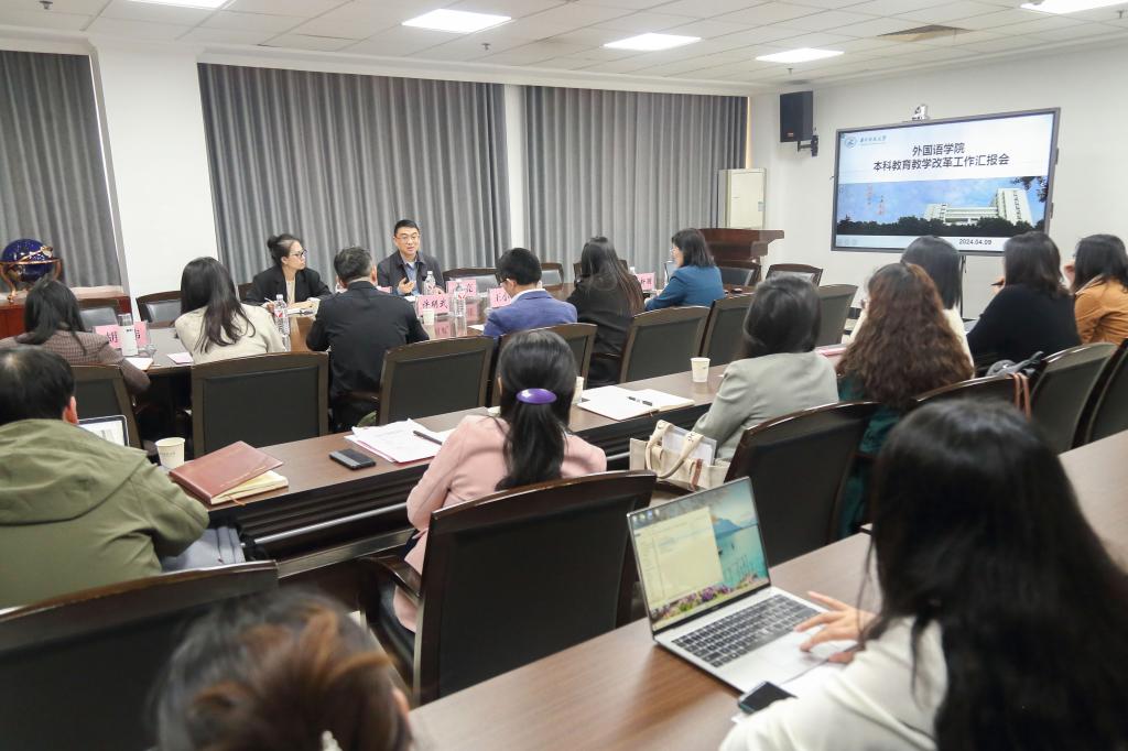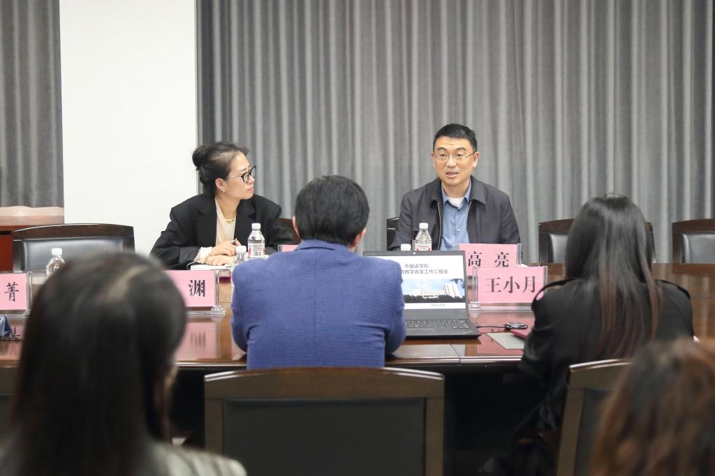 王小月代表学院对高亮的到来表示热烈的欢迎。许明武首先介绍了学院的发展概况和未来的发展规划,强调学院致力于构建教学科研并重型的发展模式和公正和谐的学院文化,实现快乐工作的愿景。他还强调通过绩效考核和学科建设等措施,不断提升人才培养和科研水平。陈新丽讲述了外语学科面临的挑战及人才培养模式创新的必要性。她提出在广泛调研和充分论证的基础上,学院应立足于自身的优势,积极寻找并弥补差距,以“守正创新,内涵发展”为指导思想,推动学院发展。她还强调学院需结合“跨、融、创”的培养特色,通过改革课程设置和教育方法,培养出更多的高素质外语人才。