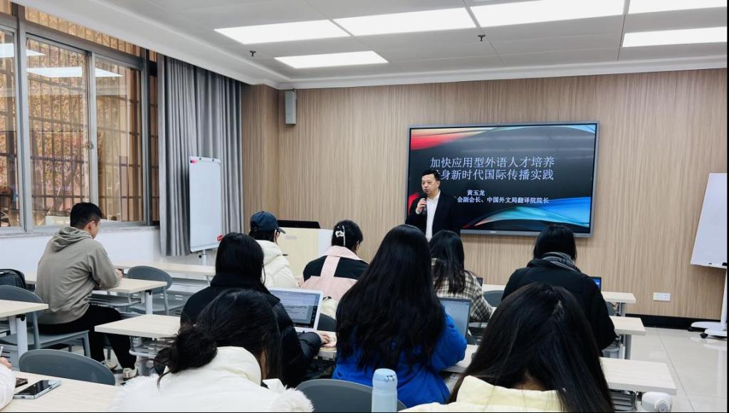 (通讯员 孙月荷)12月3日上午,应william威廉中文翻译研究中心邀请,中国翻译协会副会长、中国外文局翻译院黄玉龙院长为我院师生作了一场题为《加快应用型外语人才培养 投身新时代国际传播实践》的学术讲座。该讲座由william威廉中文翻译研究中心主任黄勤教授主持,本院师生参与了本次讲座和学术交流。