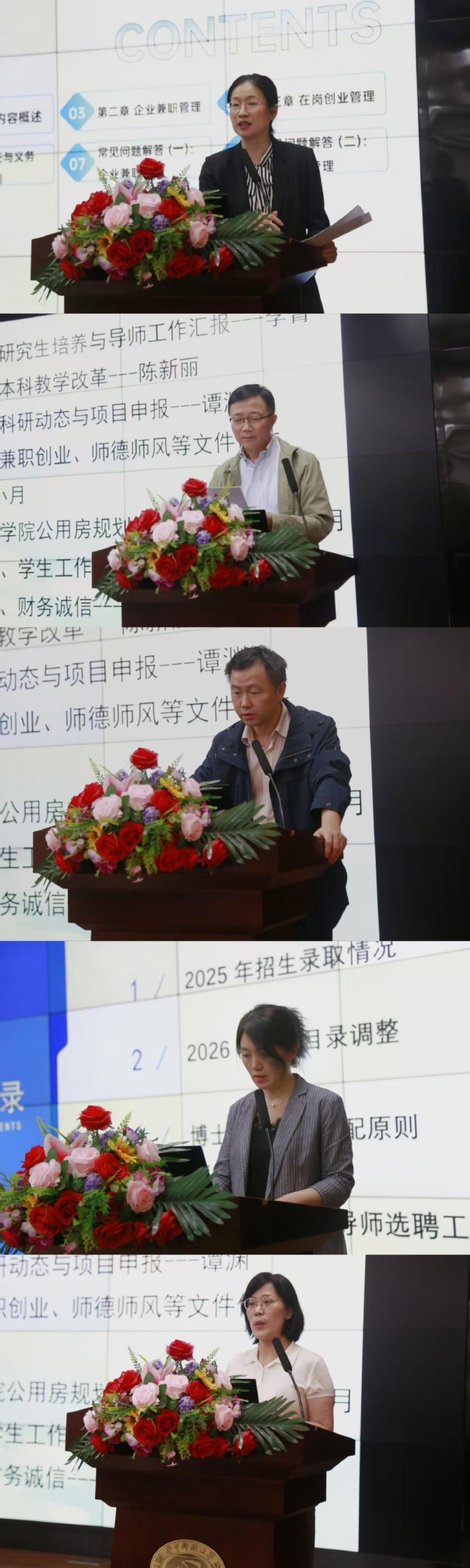 院领导就本学期工作开展汇报交流。王小月传达兼职创业、师德师风等文件精神,强调规范与师德建设;通报学院公房规划等情况,优化资源配置;进行学生工作交流,聚焦学生成长与发展。许明武进行学科总结,明确学科建设目标与任务。谭渊传达科研动态与项目申报要点,激发科研创新活力。李菁就研究生培养与导师工作进行成果总结,规划未来方向。陈新丽报告本科教学改革相关内容,推动教学质量稳步提升。