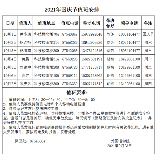 1.学院办公室负责安排“国庆”期间人员值班,值班人员应加强检查巡视,保持通讯畅通,严禁脱岗,发现问题迅速采取控制措施并及时向带班领导汇报。