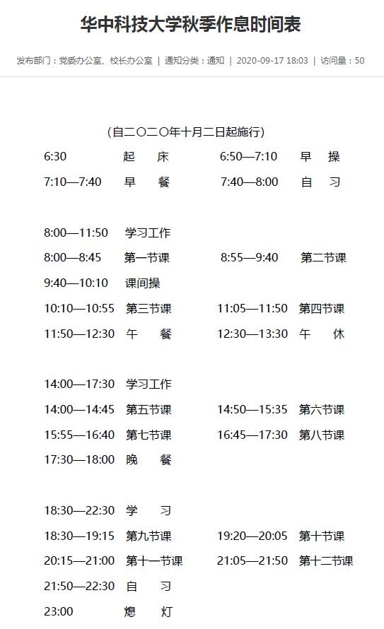 转发党委办公室、校长办公室《williamhill中文秋季作息时间表》