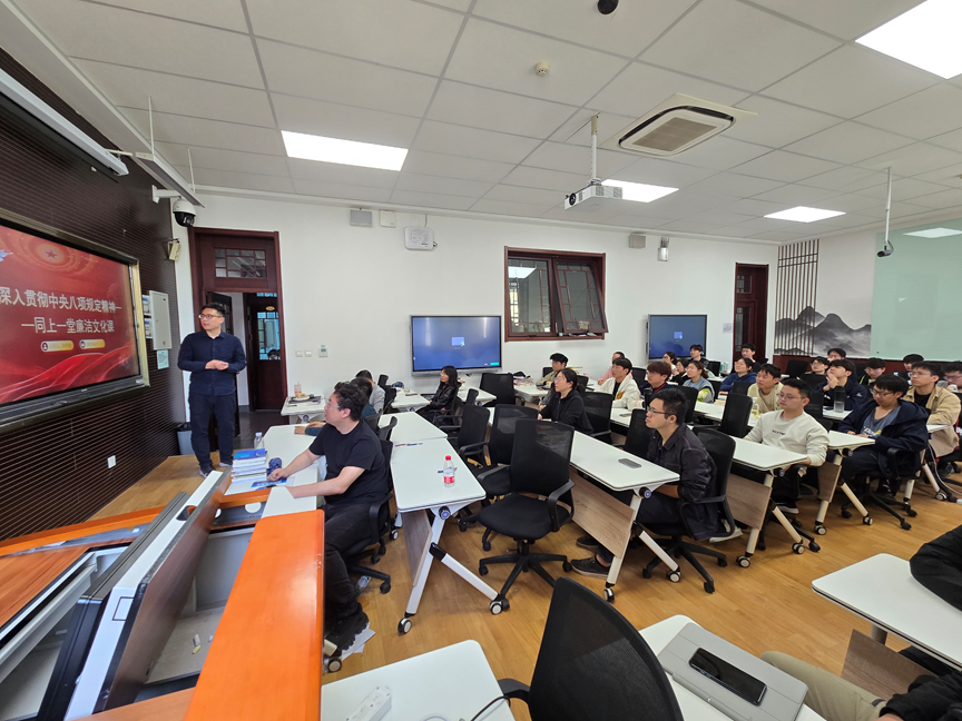 2025年4月25日,东北大学理学院力学系党支部在机电馆213开展“深入贯彻中央八项规定精神学习教育—同上一堂廉洁文化课”专题党课。力学系党支部全体教师、工程力学2201班全体成员参加了本次党课。