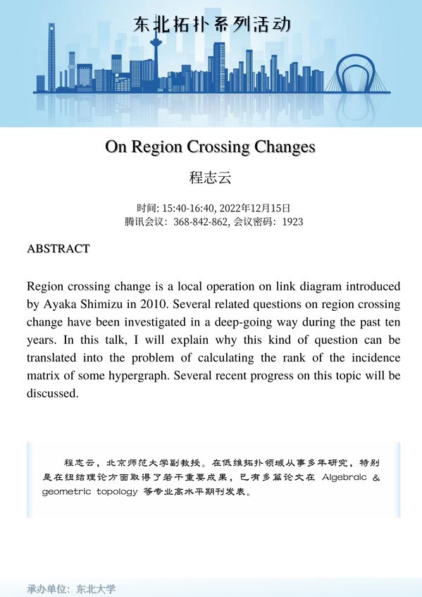 20221215日的主讲人为北京师范大学程志云,报告题目为: On regional crossing changes.