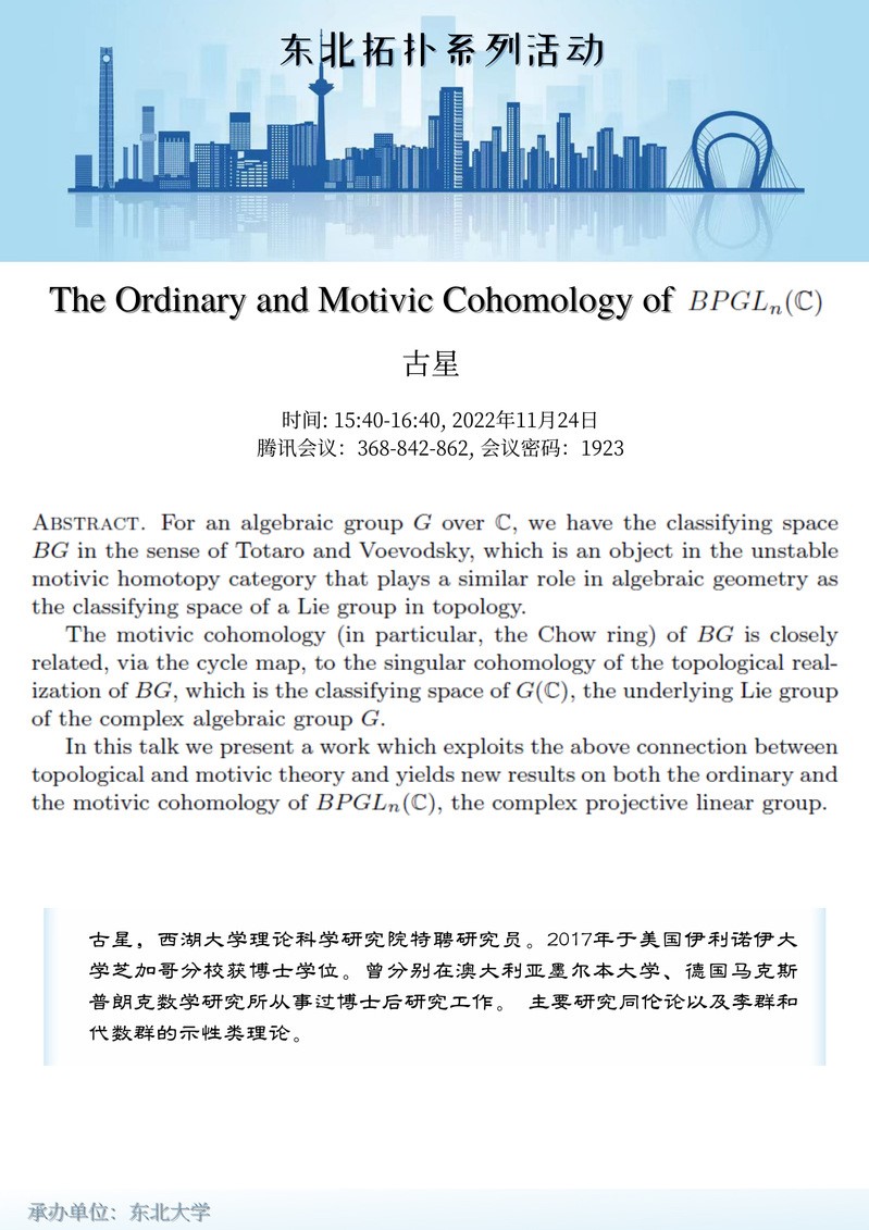 20221124日的主讲人为西湖大学理论科学研究院特聘研究员古星,报告题目为: The ordinary and motivic cohomology of BPGLn(C).