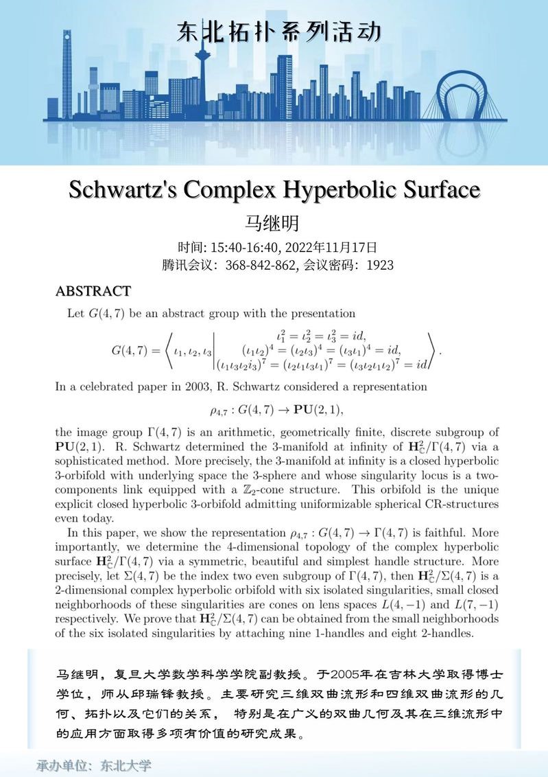 2022年11月14日的主讲人为复旦大学数学科学学院马继明教授,报告题目为: Schwartz’s complex hyperbolic surface.