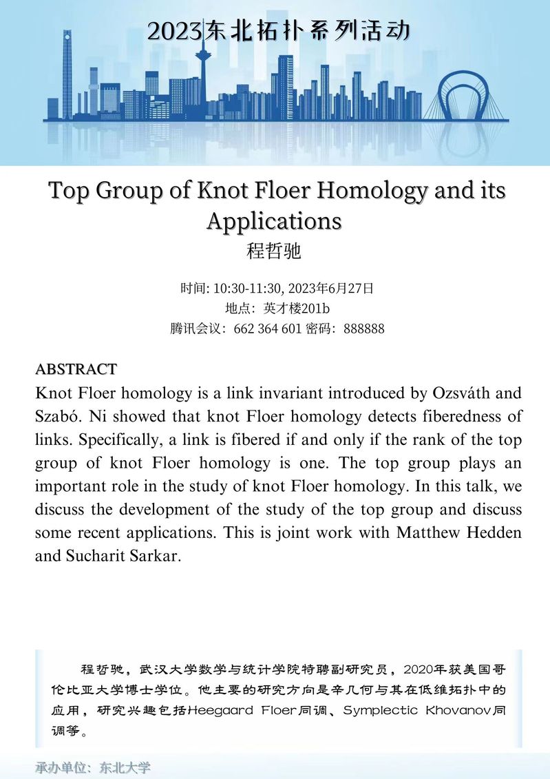 2023年6月27日的报告人为武汉大学数学与统计学院程哲驰(10:30-11:30)和上海交通大学数学科学学院李友林(14:30-15:30)。